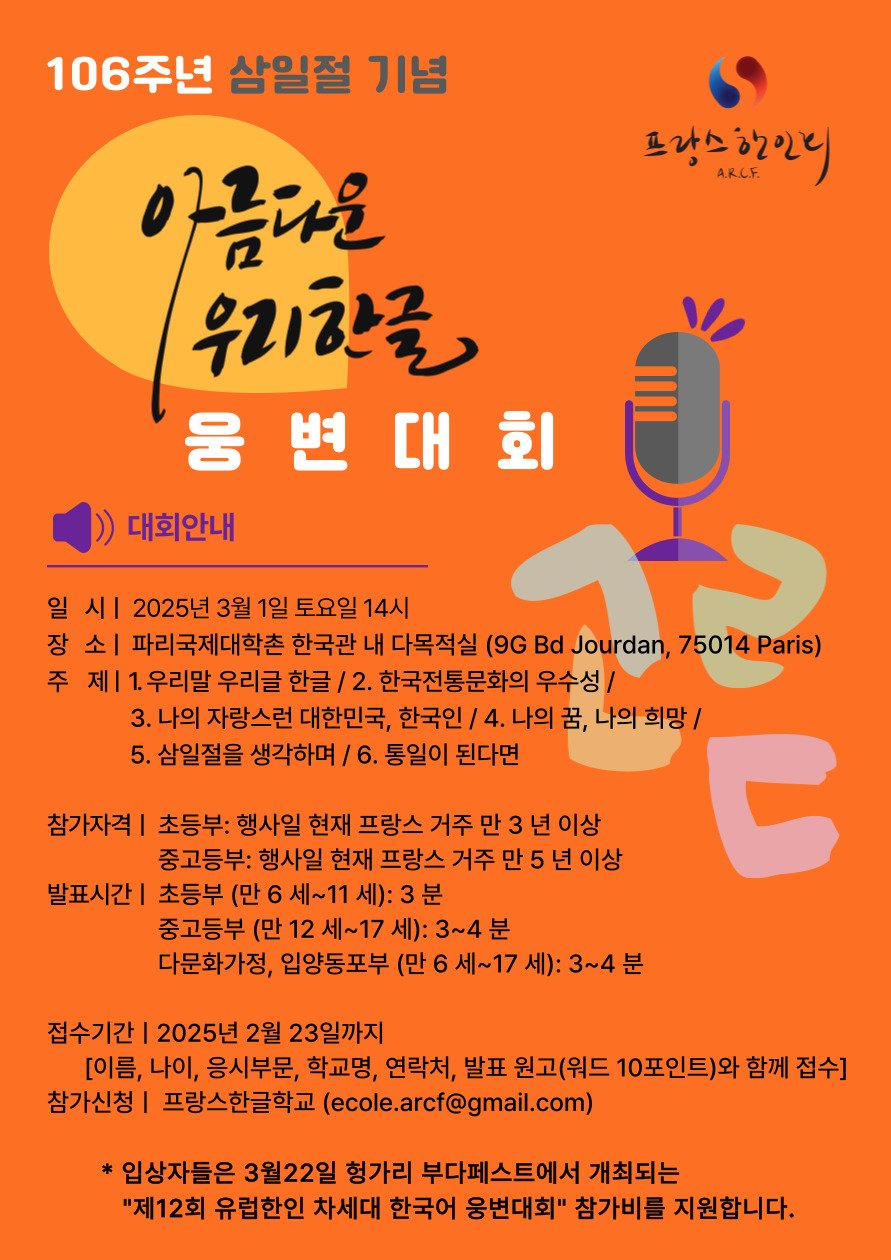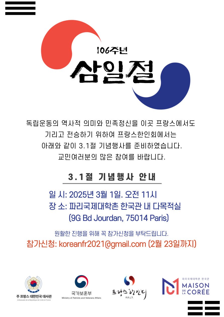 2025년 3월 1일, 삼일절 106주년을 맞아 파리국제대학촌 내 한국관에서 기념식을 개최합니다.